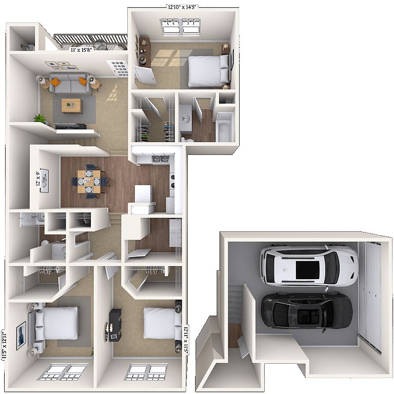 Carriage-style floor plansSpacious and open apartmentsLighted tennis courtsAttached garagesSparkling swimming pool