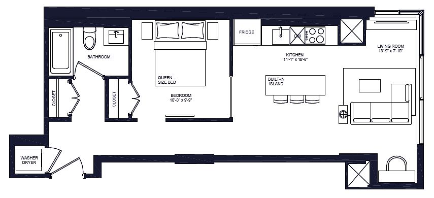 Choose from thoughtfully designed studio, one, two, and three-bedroom suites, each crafted to complement your lifestyle. Enjoy open-concept kitchens featuring sleek stone countertops, large islands, high-end stainless steel appliances, and plenty of built-in storage. Expansive windows fill your space with natural light, while bedrooms are equipped with built-in roller shades for restful sleep, spacious closets, and ample room for a queen-sized bed.