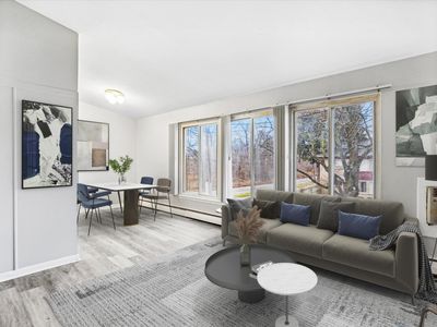 Huge windows throughoutShared front porchEat-in kitchenNew wood floorVaulted ceilingsCeiling fansHardwood floors