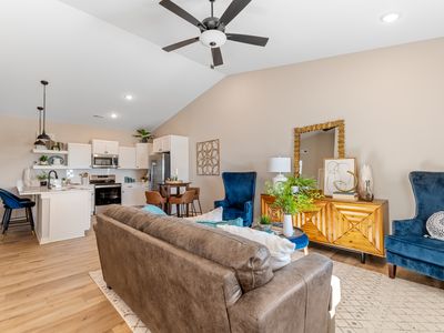 Dining room is open and tons of lighting! 2 entries to kitchen and wood flooring. Patio out back.