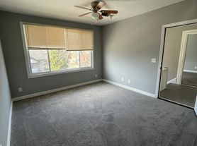 Two comfortable bedroomsModern gray paint throughoutConvenient sink areaLarge windowsAmple wall spaceCeiling fansGlass block window